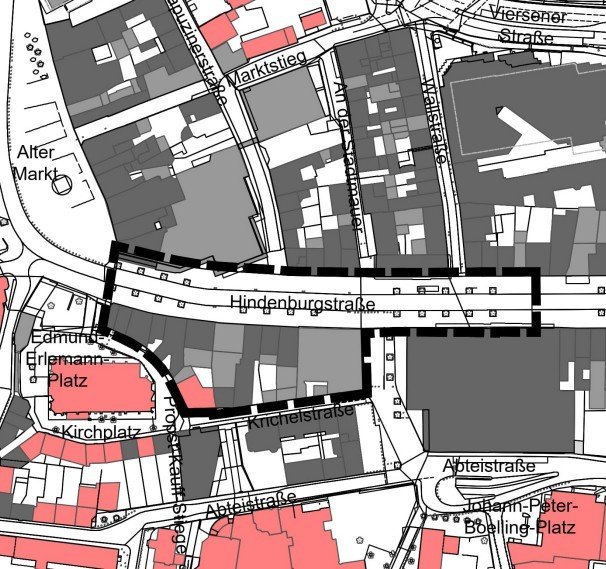 Die Stadt Mönchengladbach beabsichtigt, die planungsrechtlichen Voraussetzungen für die Beseitigung städtebaulicher Defizite innerhalb der Mönchengladbacher Innenstadt zu schaffen. Konkret erfolgt unter anderem teilweise ein Rückbau der bestehenden Bebauung sowie die Herstellung eines öffentlichen Grünraums.